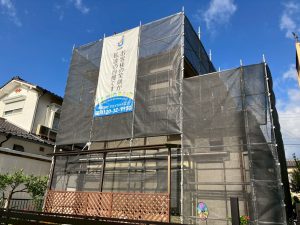まずは足場の設置です。工事を安全に行う為、工事中塗料等が周りに飛散しない為に設置します。