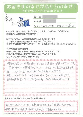 T様のお言葉本当にうれしいです。このようなうれしいアンケートを頂戴しますと、今後の励みとなります。またリフォームさせて頂く中でより一層お喜び頂ける工事をしたいと思えますのもT様のお人柄だと思います。次回お困りごとがございましてもお声を頂けます様がんばります。この度は誠にありがとうございました。