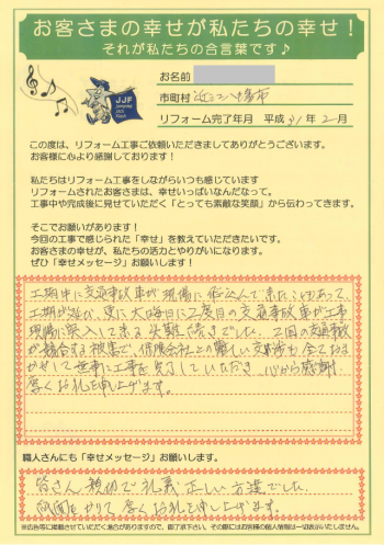 工事中での事故に大変心配された事と思います。そう言った中でも私共を信頼して頂けお任せ頂けた事を感謝しております。信念をもって自信ある施工をさせて頂きました。これからも末永くお家の事なら何なりとお声がけ頂けたらと思います。この度は誠にありがとうございました。